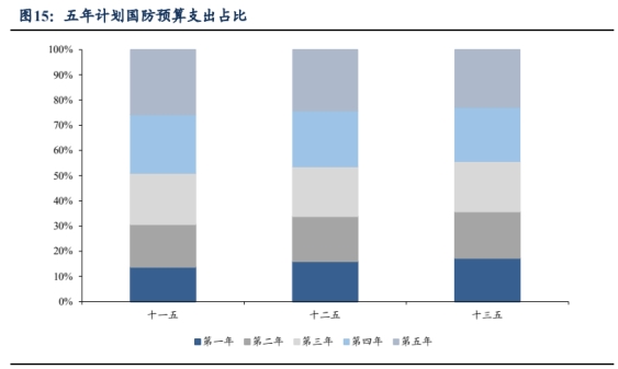 从 2011 年开始申万国防军工行业营业收入增速、归母净利润增速走势可以很明显看出,在每个五年规划中,国防军工行业业绩有明显的前低后高的特点,营业收入增速的几个高点分别为 2011 年、2014 年、2021 年,归母净利润增速几个高点分别为 2016 年、2020 年。基本都在每一个五年规划的最后一年或者第一年(订单交付、业绩确认有延后和惯性)。行业低点基本都在每一个五年规划的中间 2-3 年,国防军工行业在每一个五年规划里有很明显的前低后高的特点。2025 年十四五规划进入最后一年,按照行业特点国防军工行业有望进入十四五规划的高峰,行业基本面有望否极泰来,迎来反转。