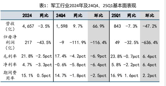 24年军工行业实现营收4657亿元(同比-3.5%),归母净利润217亿元(同比-43.5%),利润端较收入端更为承压,主要由于订单延期下发以及军品价格调整所致。24年军工行业毛利率21.8%(同比-2.5pct),净利率4.7%(同比-3.3pct),期间费用率15.1%(同比+0.5pct)。军品存在降价压力,毛利率小幅下降;费用支出存在刚性,管理费用率有所提升。行业相关公司加强研发投入,研发费用率7.1%,同比+0.2pct,新型号新产品稳步推进。
