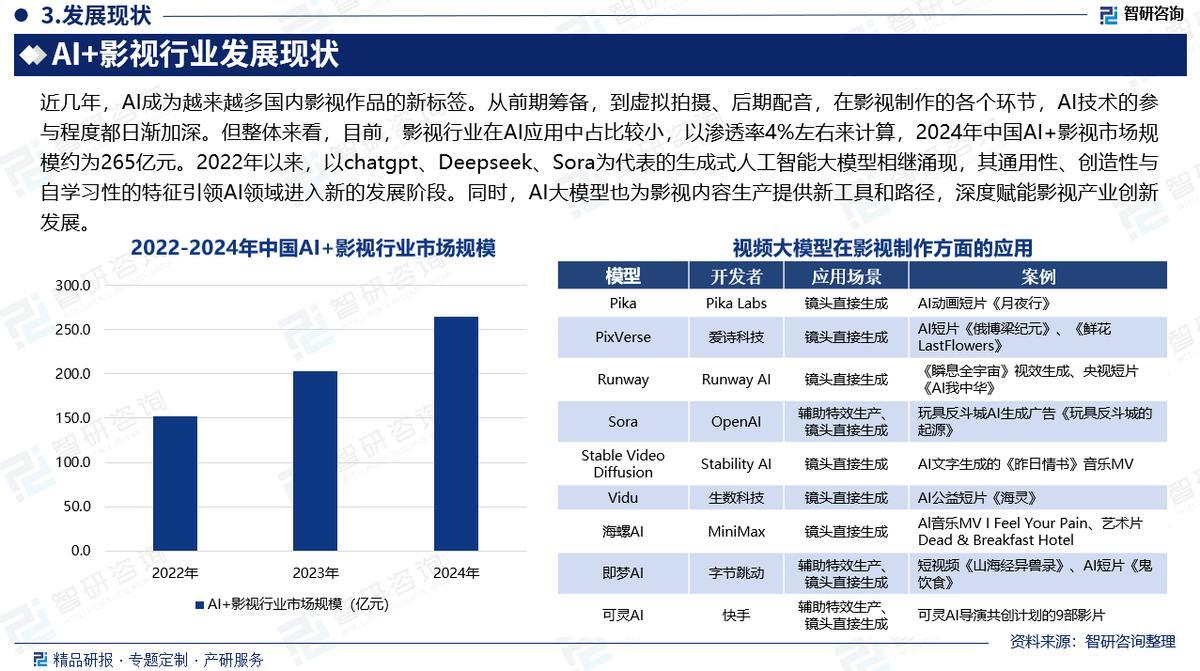 近几年,AI成为越来越多国内影视作品的新标签。从前期筹备,到虚拟拍摄、后期配音,在影视制作的各个环节,AI技术的参与程度都日渐加深。但整体来看,目前,影视行业在AI应用中占比较小,以渗透率4%左右来计算,2024年中国AI+影视市场规模约为265亿元。2022年以来,以chatgpt、Deepseek、Sora为代表的生成式人工智能大模型相继涌现,其通用性、创造性与自学习性的特征引领AI领域进入新的发展阶段。同时,AI大模型也为影视内容生产提供新工具和路径,深度赋能影视产业创新发展。
