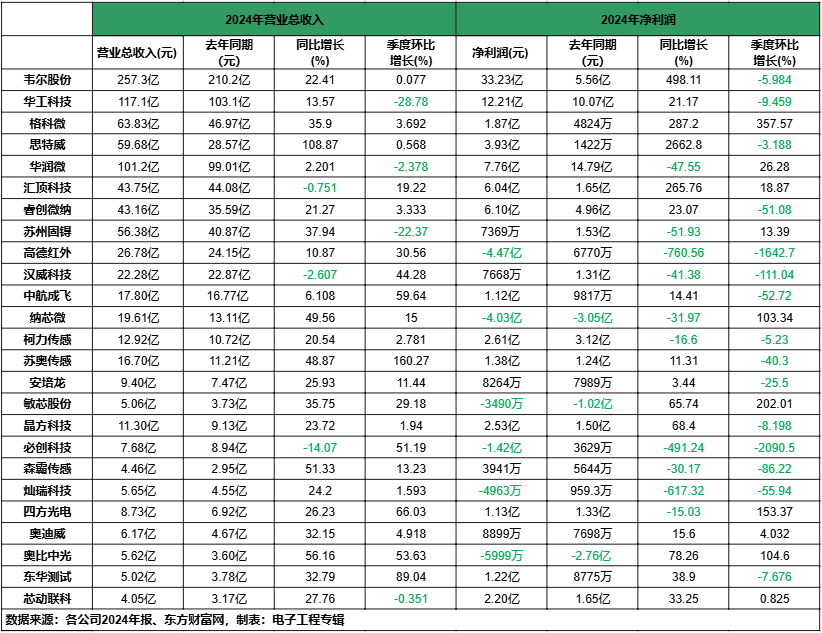 图表1:25家中国传感器上市企业2024年度经营情况汇总