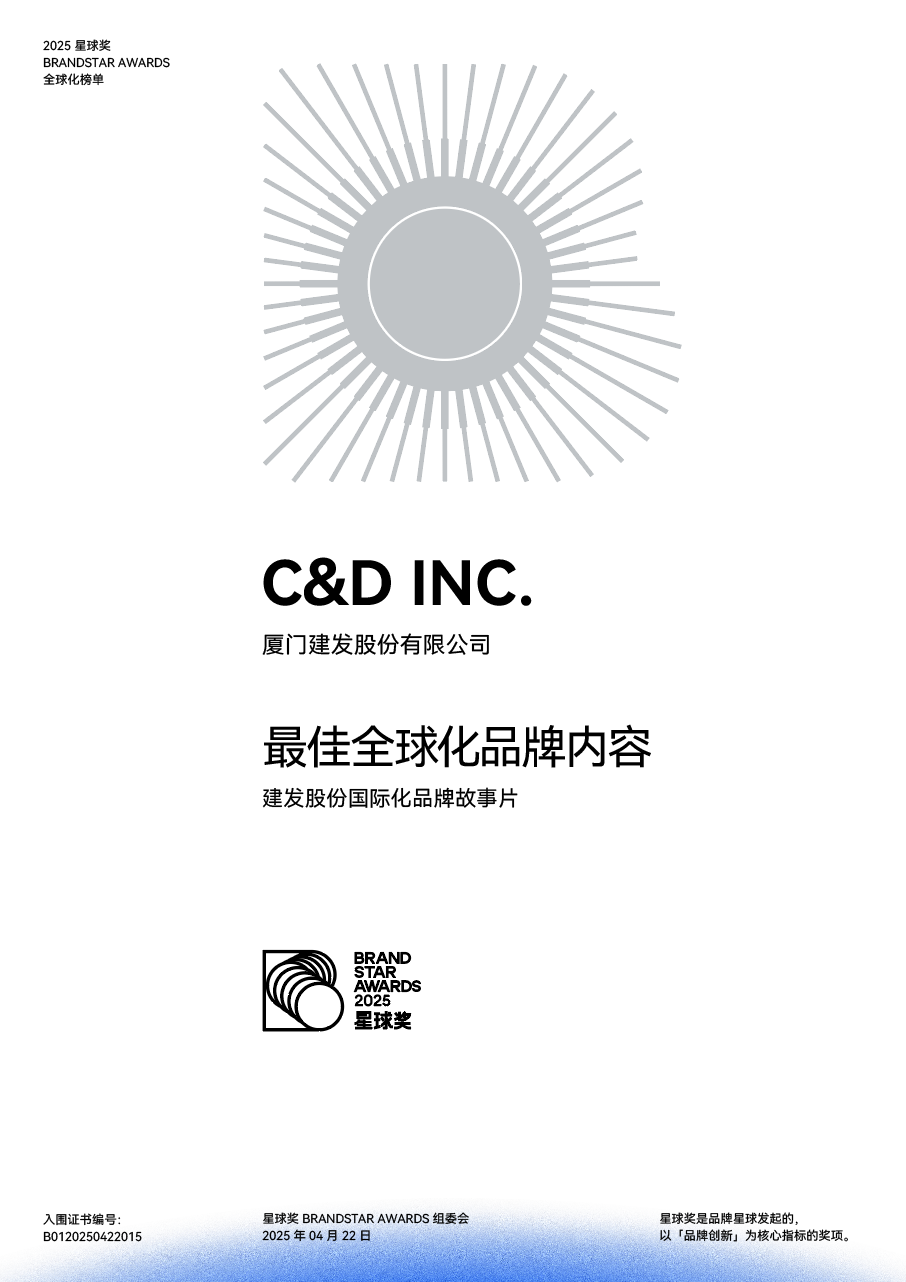 近日,2025品牌星球出海大会在深圳举行。大会同期发布了2025星球奖全球化榜单,建发股份(600153.SH)于2024年拍摄的系列国际化品牌故事片,凭借高质量的内容创意与创新的表现形式,入围“最佳全球化品牌内容”。