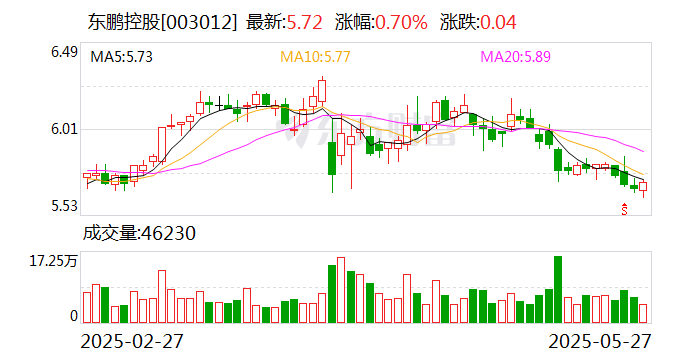 证券时报·数据宝统计显示,东鹏控股今日收盘价为5.72元,上涨0.70%,日换手率为0.40%,成交额为2626.71万元,全天主力资金净流出13.04万元,近5日该股累计下跌1.84%,近5日资金合计净流出1355.22万元。(数据宝)