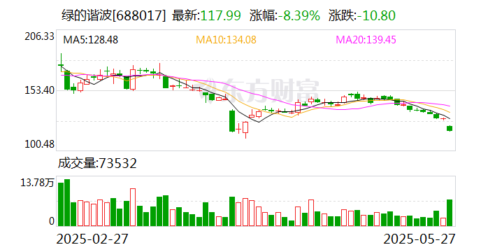 证券时报·数据宝统计显示,绿的谐波今日收盘价为117.99元,下跌8.39%,日换手率为4.36%,成交额为8.77亿元,全天主力资金净流出9676.24万元,近5日该股累计下跌13.26%,近5日资金合计净流出3.11亿元。
