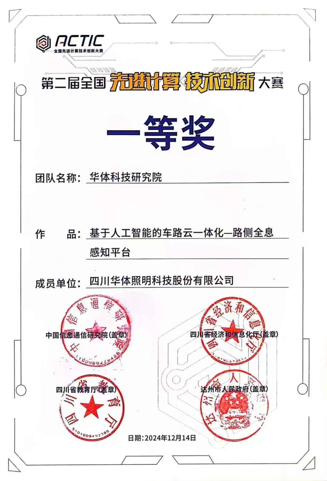 在由中国信息通信研究院、四川省经济和信息化厅、四川省教育厅、达州市人民政府联合举办的第二届全国先进计算技术创新大赛中,华体科技(维权)(603679)研究院凭借作品《基于人工智能的车路云一体化路侧全息感知平台》荣获大赛一等奖!