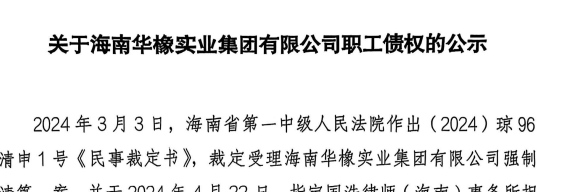 5月27日,海南华橡实业集团有限公司清算组,对外公示职工债权。