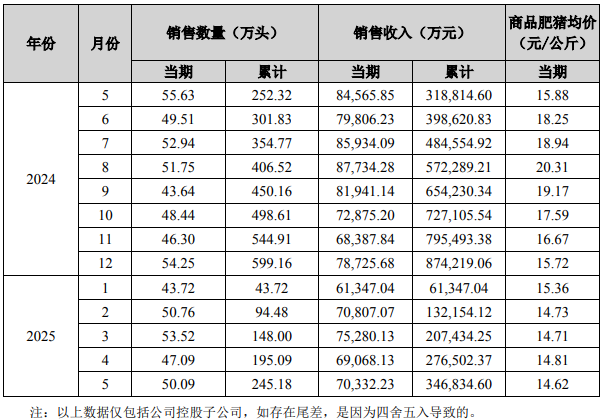 2025年1-5月销售商品猪245.18万头(其中仔猪销售77.49万头),销售收入346,834.60万元,销售均价16.26元/公斤(商品肥猪均价为14.83元/公斤),同比变动分别为-2.83%、8.79%、4.97%。