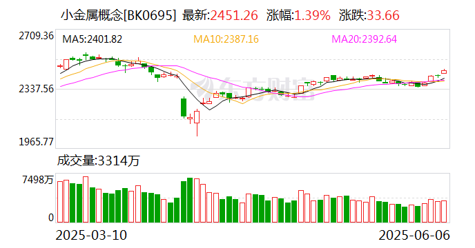 6月6日早盘,A股小金属板块开盘持续上行,截至午间收盘,万得小金属指数上涨0.82%,个股中浩通科技上涨超11%,贵研铂业、安宁股份、华阳新材涨幅居前,分别为4.48%、4.06%、2%。
