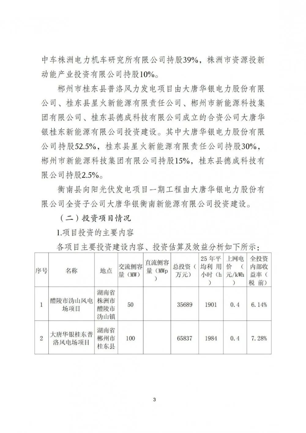 其中,醴陵市沩山风电场项目位于湖南省株洲市醴陵市沩山镇,容量50MW,总投资35689万元;大唐华银桂东普洛风电场项目位于湖南省郴州市桂东县,容量100MW,总投资65837万元;衡南县向阳光伏发电项目一期工程位于湖南省衡阳市衡南县,容量80MW,总投资38281.51万元。