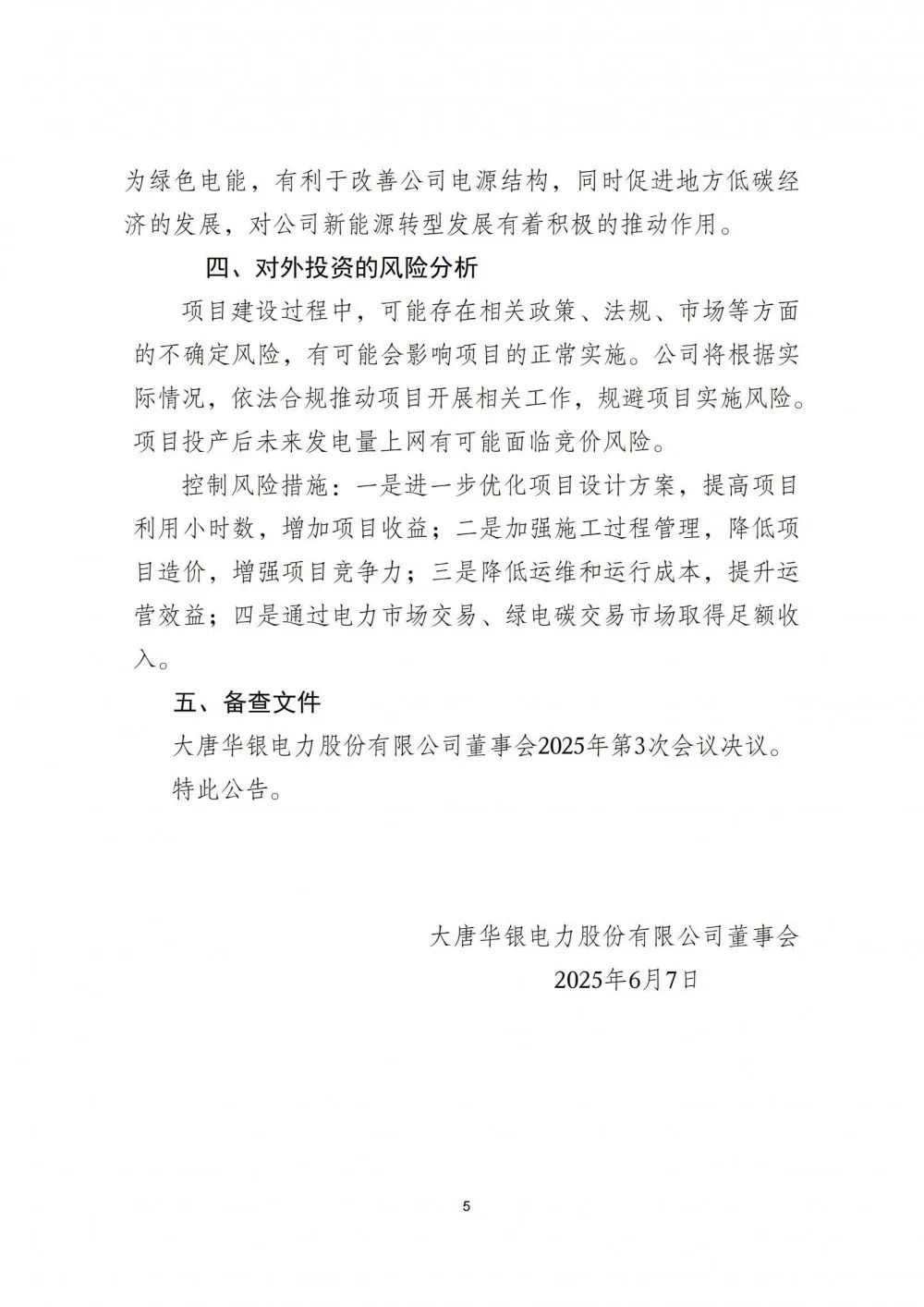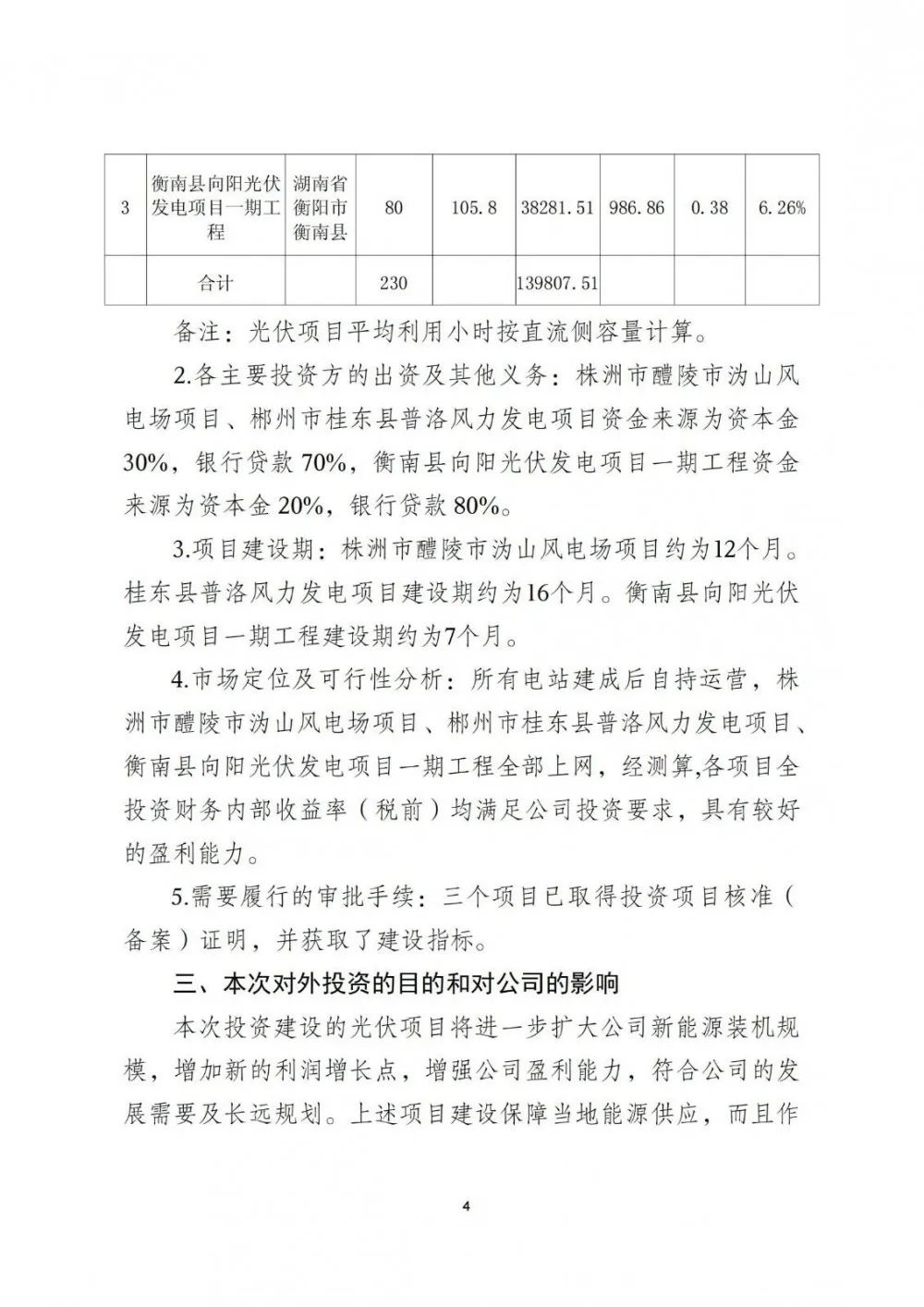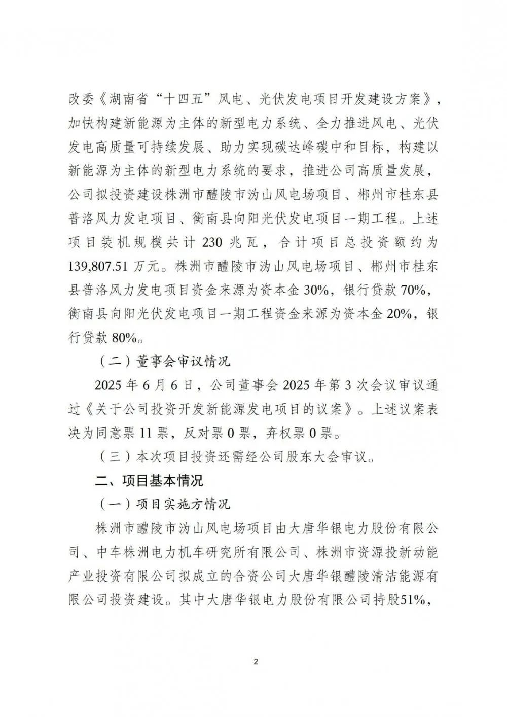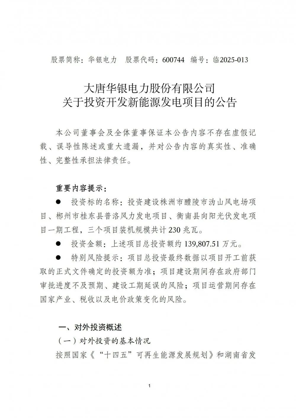 6月7日,大唐华银电力股份有限公司发布关于投资开发新能源发电项目的公告。公告显示,华银电力拟投资建设株洲市醴陵市沩山风电场项目、郴州市桂东县普洛风力发电项目、衡南县向阳光伏发电项目一期工程。上述项目装机规模共计230兆瓦,合计项目总投资额约为139,807.51万元。