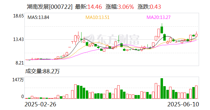 湖南发展6月10日晚间发布公告称,本次利润分配方案以2024年12月31日总股本约4.64亿股为基数,每10股派发现金红利0.5元(含税),不送红股,不以公积金转增股本,总计派发现金红利约2321万元(含税),占合并报表中归属于上市公司股东净利润的34.23%,剩余未分配利润结转以后年度分配。股权登记日为2025年6月17日。除权除息日为2025年6月18日。