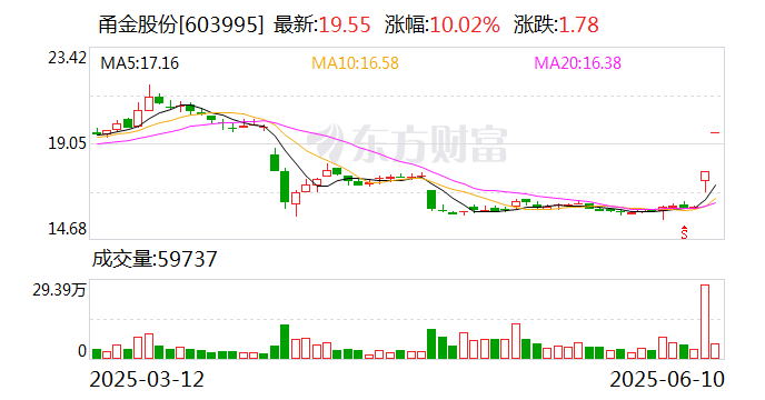 证券时报·数据宝统计显示,甬金股份今日收盘价为19.55元,上涨10.02%,日换手率为1.63%,成交额为1.17亿元,全天主力资金净流入5431.67万元,近5日该股累计上涨20.82%,近5日资金合计净流入1.19亿元。