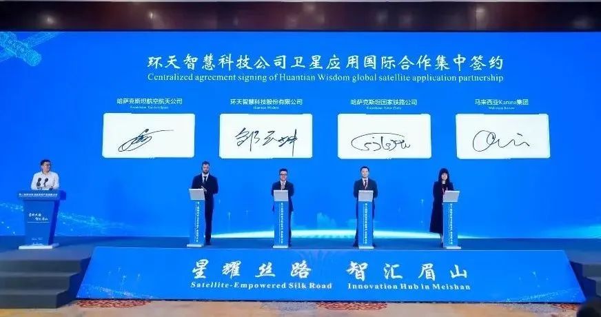 作为大会的重要成果,眉山天府新区卫星产业链主企业环天智慧科技股份有限公司与哈萨克斯坦国家铁路公司、哈萨克斯坦Kazaerospace公司、马来西亚Karuna集团签署了卫星应用国际合作项目协议。根据协议,环天智慧将与各方围绕卫星影像分发、智慧城市监测、数据智能解译、专题服务及科研合作等领域展开深度合作,实现资源共享与技术协同。