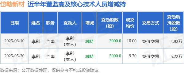 岱勒新材近半年内的董监高及核心技术人员增减持详情如下: