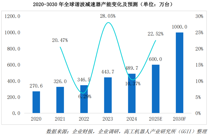 GGII通过对各厂商产能的跟踪调研,2024年,全球谐波减速器产能489.7万台,同比增长10.37%,随着入局者的增加,以及各厂商新建项目的逐渐达产,预计2025年将达到600万台,基于对人形机器人赛道长远发展的评估,预计到2030年全球谐波减速器产能有望突破1000万台。