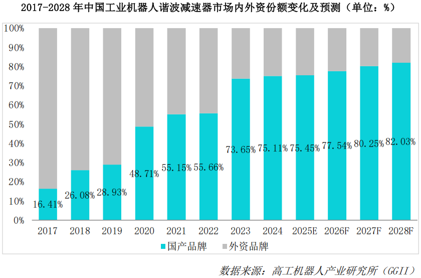 从内外资竞争角度看,过去数年国产厂商份额提升明显,GGII数据显示,2020年国产谐波减速器份额为48.71%,2021年国产份额提升至55.15%,首次超过外资厂商份额,2024年国产份额进一步提升至75.11%。2017-2024 年,国产谐波减速器市场份额呈持续上升趋势。