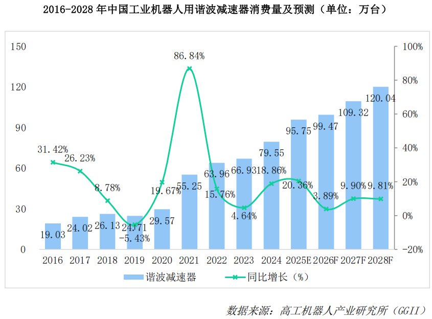 GGII数据显示,2024年中国工业机器人谐波减速器消费量为79.55万台,同比增长18.86%。预计到2028年,中国工业机器人谐波减速器消费量将增长至120.04万台。