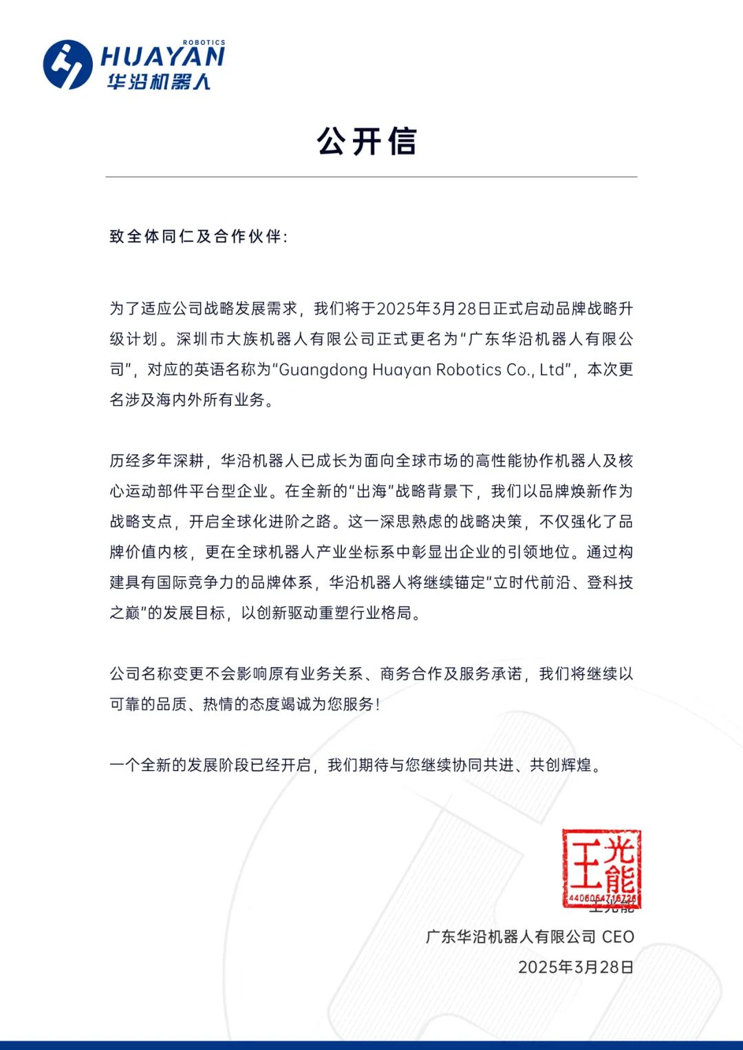 广东华沿机器人成立于2017年9月,前身为深圳市大族机器人有限公司,2025年完成品牌升级并更名。