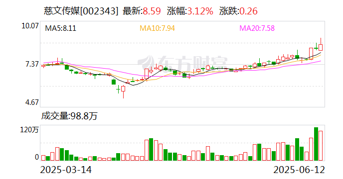 证券时报·数据宝统计,截至发稿,慈文传媒收盘价为8.59元,上涨3.12%,本期筹码集中以来股价累计上涨9.99%。具体到各交易日,4次上涨,4次下跌,其中,涨停1次。