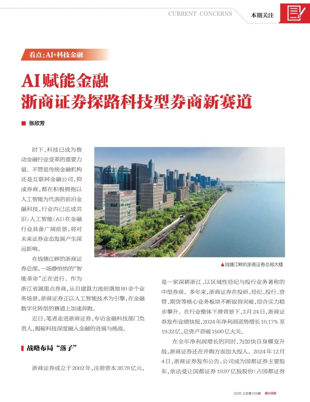 近日,《浙江国资》2025年第2期·总第133期刊发浙商证券的专访文章《AI赋能金融浙商证券探路科技型券商新赛道》,现予以转载,以飨读者。