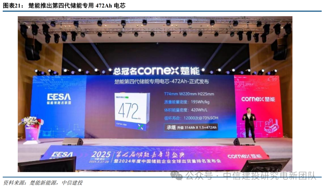 海辰储能推出全球首款千Ah级长时储能电池。海辰储能宣布∞Cell 1175Ah电芯产品成功实现量产。该电池采用全极耳叠片技术,搭配三明治顶盖结构,有效缩短电流过流路径,使电芯阻抗较280Ah电芯降低65%以上,解决了大容量电芯的核心散热问题。产品单体称标容量1175Ah,能量密度>180Wh/kg,开启了长时储能规模化应用的新阶段,填补了中长时储能场景缺少专用电池的产品空白,有望成为市场的新标杆。