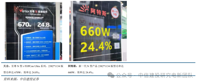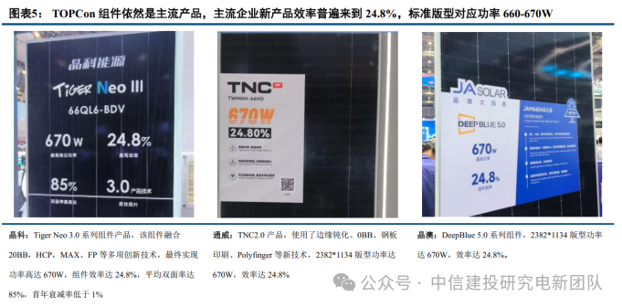 3、TOPCon组件依然是主流产品,叠加0BB、边缘钝化、钢板印刷、Polyfinger等提效技术,头部厂商新产品效率均来到24.8%左右;