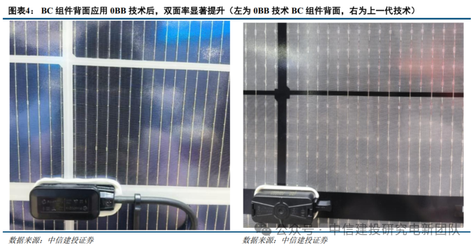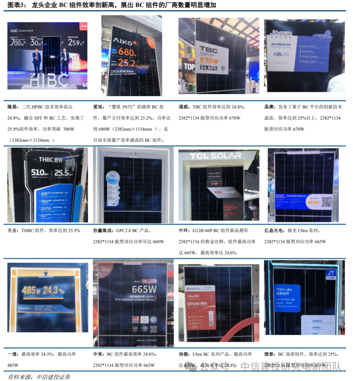 2、展出BC组件的厂商显著增加,产品效率、双面率显著提升,龙头效率来到25%以上,其他厂商普遍在24.8%左右,0BB技术的应用使双面率提升至75%-85%,与TOPCon差距不到10%;