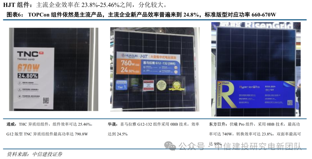 HJT组件:主流企业效率在23.8%-25.46%之间,分化较大。