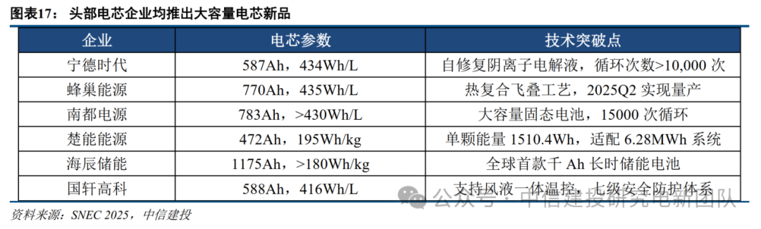 2、电芯方面,宁德时代、海辰储能、南都电源等均推出新一代大容量电芯,单体容量均超过500Ah门槛。从容量参数看,电芯容量不断攀升,从五百余Ah迈向千Ah级别;能量密度等关键指标也同步优化,如宁德、南都产品能量密度均超过430Wh/L,反映出行业正聚焦大容量、高性能电芯研发。借单体大型化提升储能系统效能与经济性,大容量电芯已成为驱动储能产业升级的核心方向。