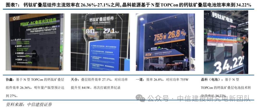 钙钛矿叠层组件:主流效率在26.36%-27.1%之间,大规格组件数量增加,晶科能源基于N型TOPCon电池救赎的钙钛矿叠层电池转换效率达到34.22%。