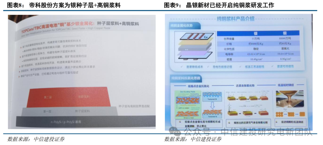 金属化降本:降本压力下使用含铜浆料代替银浆成为主要思路,如已经推出的聚和纯铜浆、帝科高铜浆料,晶银新材也在积极研发纯铜浆。