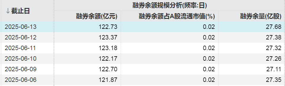 融券规模超120亿元Wind数据显示,截至6月13日,A股市场融券余额为122.73亿元,上周融券余额增加0.86亿元,融券余量为27.68亿股。