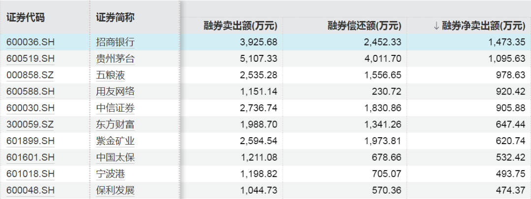 上周融券净卖出额居前的股票为招商银行、贵州茅台、五粮液,分别为1473.35万元、1095.63万元、978.63万元。