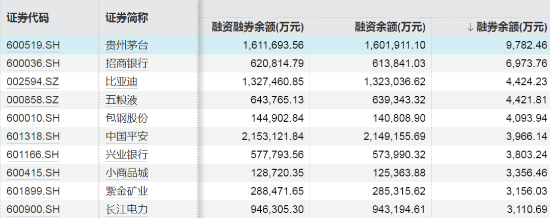 Wind数据显示,截至6月13日,A股市场融券余额居前的股票分别为贵州茅台、招商银行、比亚迪,融券余额分别为0.98亿元、0.70亿元、0.44亿元。