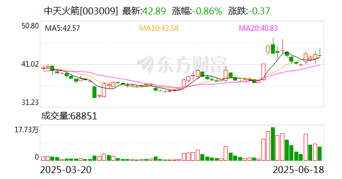 中天火箭6月18日午盘收于43.72元/股,涨幅1.06%。