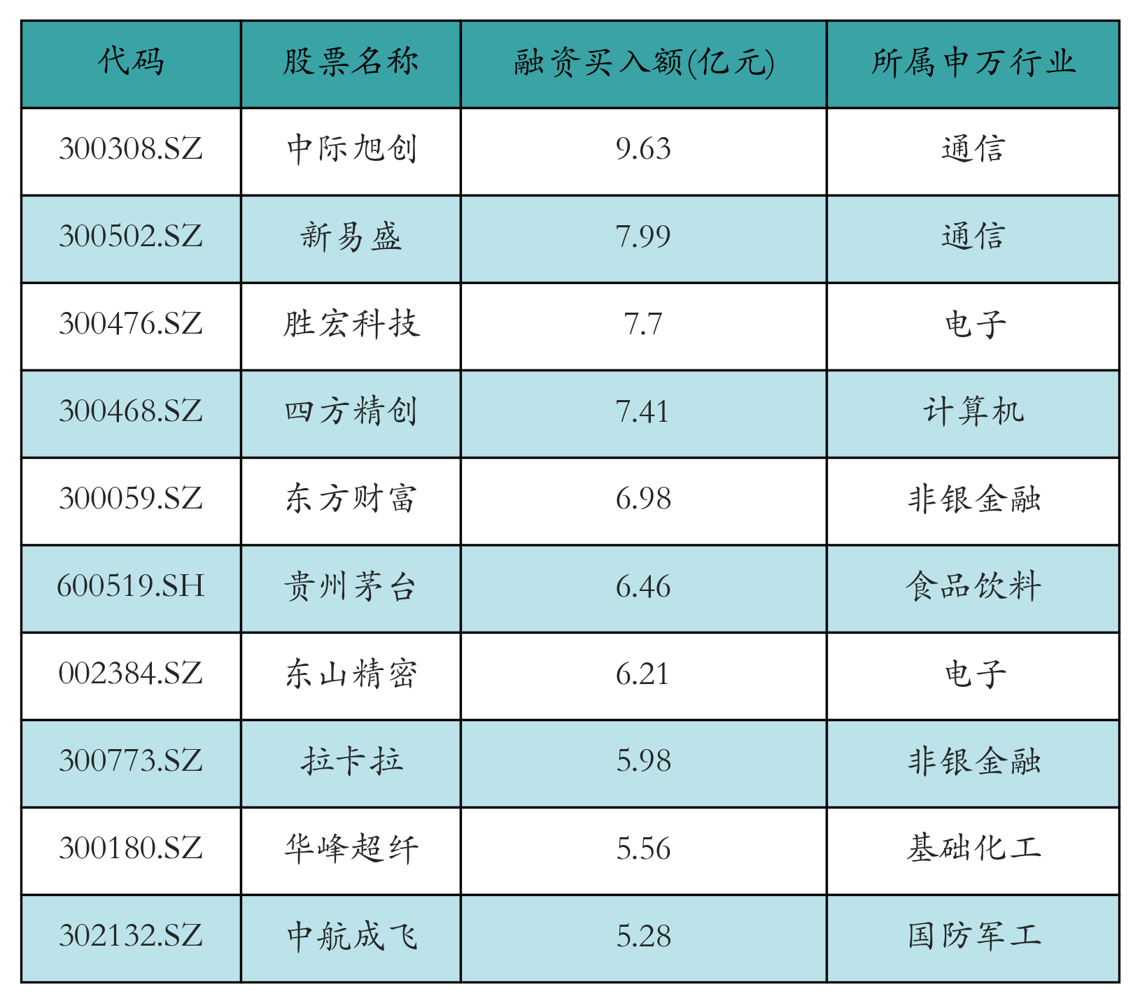 两市共有3411只个股有融资资金买入,其中中际旭创、新易盛、胜宏科技排名前三,买入金额分别9.63亿元、7.99亿元、7.7亿元。融资买入额前10个股详情见下表: