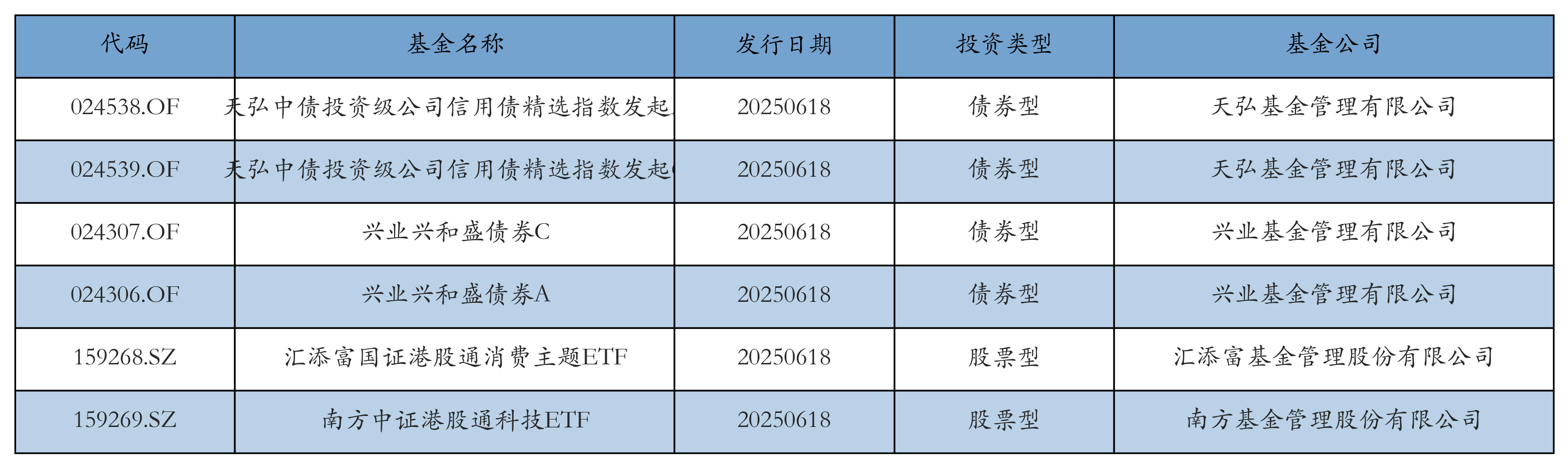 昨日有6只新基金发行,分别为:天弘中债投资级公司信用债精选指数发起A、天弘中债投资级公司信用债精选指数发起C、兴业兴和盛债券C、兴业兴和盛债券A、汇添富国证港股通消费主题ETF、南方中证港股通科技ETF,详情见下表: