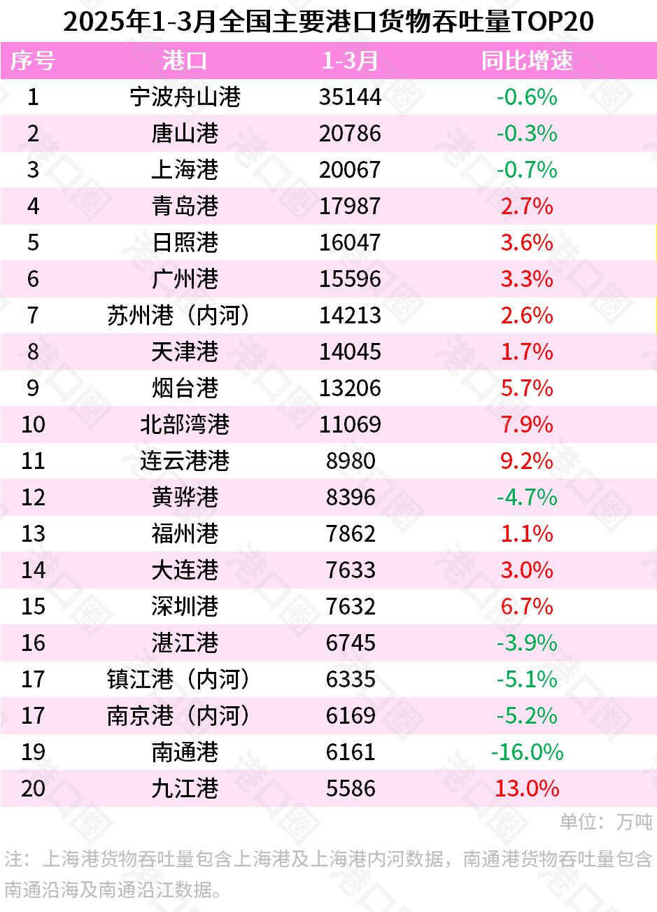 1-3月全国主要港口货物吞吐量前十名为:宁波舟山港(第1)、唐山港(第2)、上海港(第3)、青岛港(第4)、日照港(第5)、广州港(第6)、苏州港(第7)、天津港(第8)、烟台港(第9)、北部湾港(第10)。其中苏州港上升1名,位列榜单第7;福州港排名上升2名,位列榜单第13。
