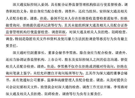期间公司及相关人员存在拒绝签收监督检查、调查通知书,拒绝检查、调查人员进入办公场所,拒绝接受询问并强行闯入询问场所阻断询问,强行带离正在接受询问的人员,辱骂、威胁检查、调查人员等拒绝、阻碍检查、调查的行为。