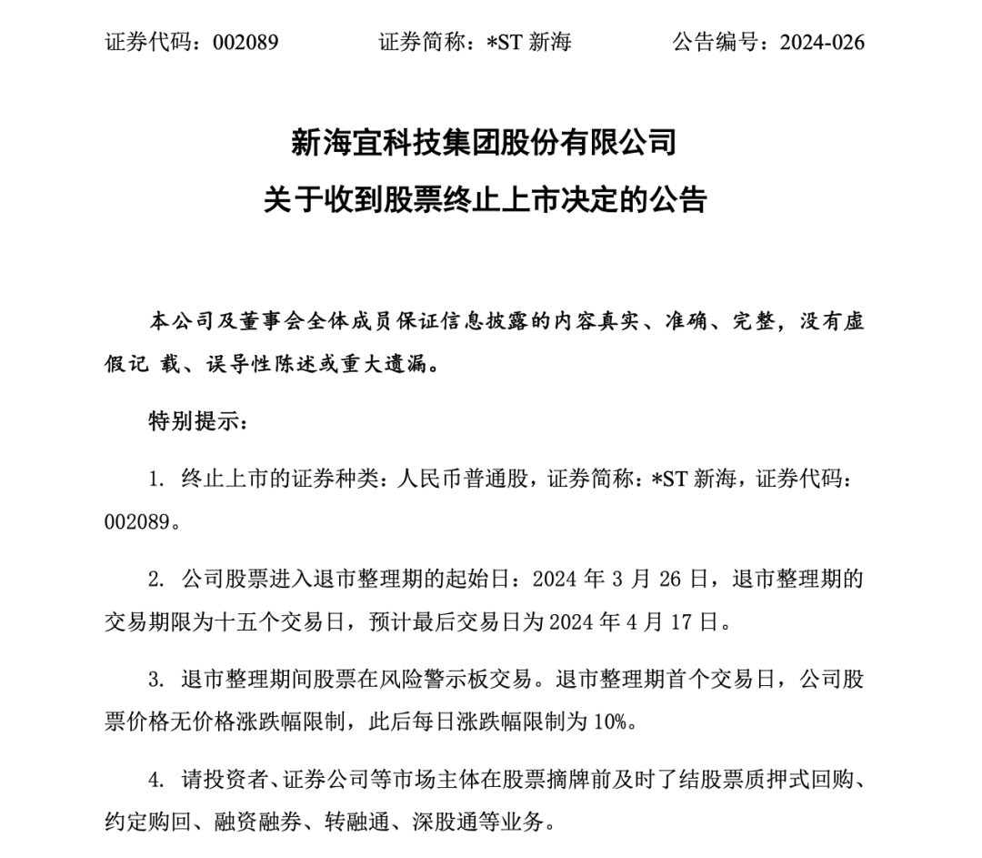 3月18日晚间,*ST新海公告称,公司收到深交所下发的《关于新海宜科技集团股份有限公司股票终止上市的决定》,深交所决定终止公司股票上市。这意味着,*ST新海成为2024年首个重大违法强制退市案例。