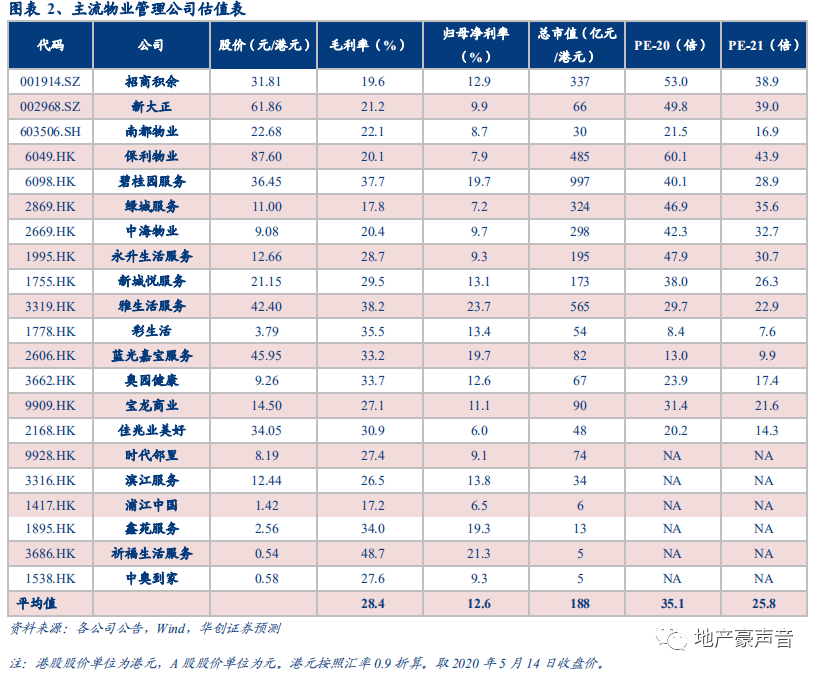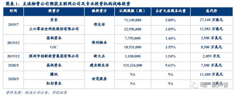 5月14日,世茂服务引入战略投资者红杉资本中国基金和腾讯控股,两者分别投资 1.30 亿美元及 1.14 亿美元。红杉资本中国基金将支持世茂服务与红杉生态体系协同发展,协助企业引入极具价值的小区商业资源,并进一步通过物联网、云计算、大数据等技术应用,以科技赋能助力世茂服务实现经营管理能力及效率的提升和优化。而腾讯则将利用线上线下融合的平台优势以及助力商业新生态的能力,帮助世茂服务加速数字化升级。2019年7月,京东,以及基石股东360.com和彩生活在资本和业务层面达成战略合作协议,按每股5.22港元分别认购彩生活7,114.9万股、2,295.6万股新股份,二者分别持有的权益总额占彩生活扩股后已发行股份的5.00%、3.05%。19年12月,GIC、高瓴资本作为基石投资者,分别认购保利物业8,500、3,500万美元的发售股份,分别占总股本3.55%、1.46%。20年5月,高瓴资本作为基石投资者,认购建业新生活7,500万美元股份,占总股本9.61%。我们认为,近期,互联网企业及专业投资机构频频战略投资主流物业管理公司,包括京东和360投资彩生活;高瓴资本投资保利物业、建业新生活等,显示物管公司流量经济概念广受认可,并科技赋能物业管理,有望助力物管公司逐步挖掘物业管理服务产业全链条价值,催生更多元化增值服务萌芽,在行业发展第二阶段逐步打开更为广阔的成长空间。