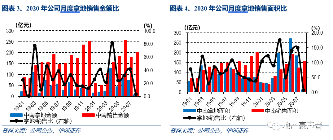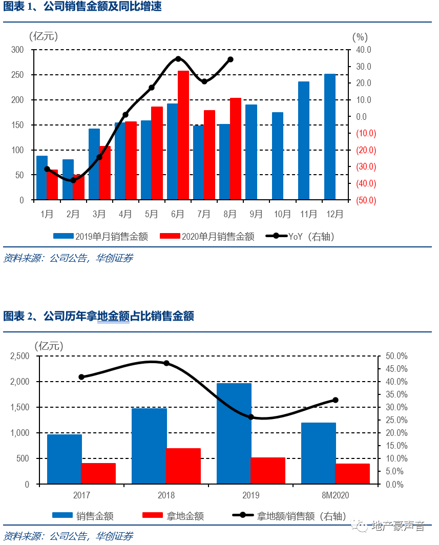 8月公司签约金额202.7亿元,环比增长13.9%、同比增长34.2%;实现签约面积157.2万平,环比增长28.1%、同比增长37.7%;销售均价12,894元/平,环比下降11.1%、同比下降2.5%。1-8月公司累计签约金额1,194.7亿元,同比增长7.6%,较1-7月提高4.2pct;累计签约面积889.1万平,同比增长2.1%,较1-7月提升5.6pct;累计销售均价13,435元/平,同比增长5.5%,较1-7月下降1.5pct。我们维持主流房企20Q3销售金额同比增长有望超20%的判断,并且考虑到房企全年销售计划完成约束或将预示20Q4销售仍将保持稳增。在全国销售持续回升的背景下,公司年初至今拿地较积极,料2020年可售货值将有所增长,助力公司全年达成销售额+15%的目标。