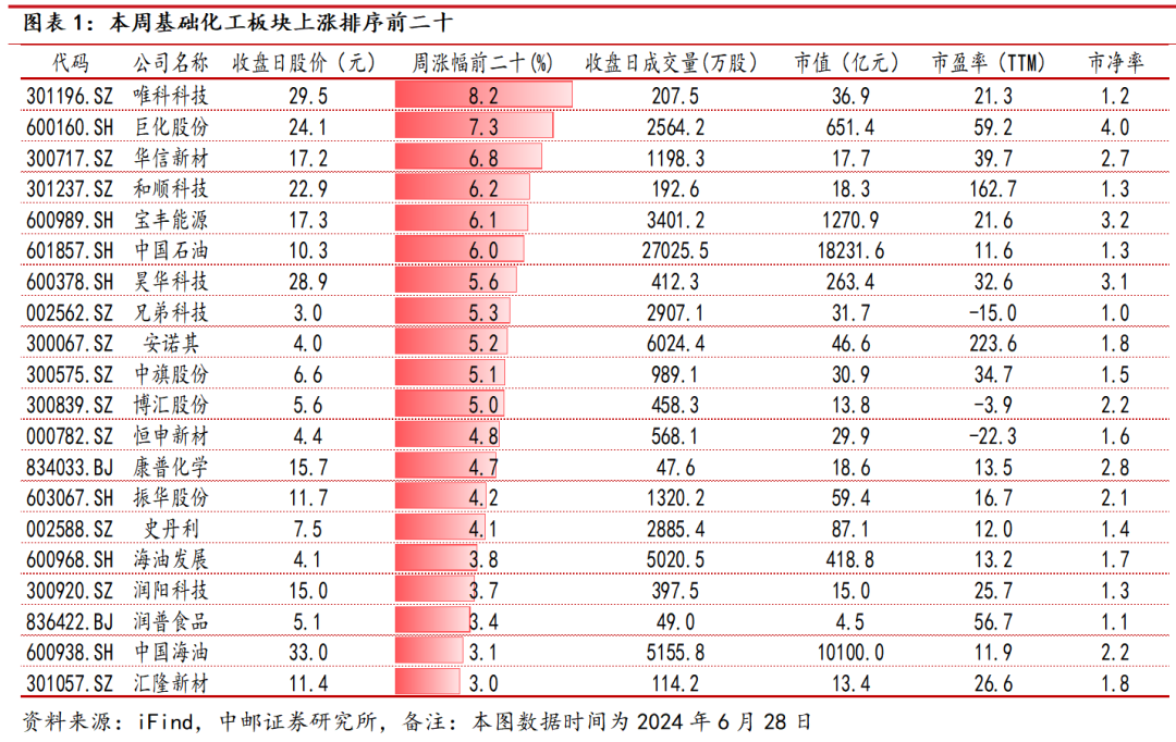 本周基础化工板块上涨排序前二十:唯科科技(8.17%)、巨化股份(7.29%)、华信新材(6.77%)、和顺科技(6.18%)、宝丰能源(6.12%)、中国石油(5.95%)、昊华科技(5.59%)、兄弟科技(5.30%)、安诺其(5.21%)、中旗股份(5.06%)、博汇股份(5.04%)、恒申新材(4.81%)、康普化学(4.68%)、振华股份(4.20%)、史丹利(4.15%)、海油发展(3.78%)、润阳科技(3.65%)、润普食品(3.45%)、中国海油(3.13%)、汇隆新材(2.98%)。
