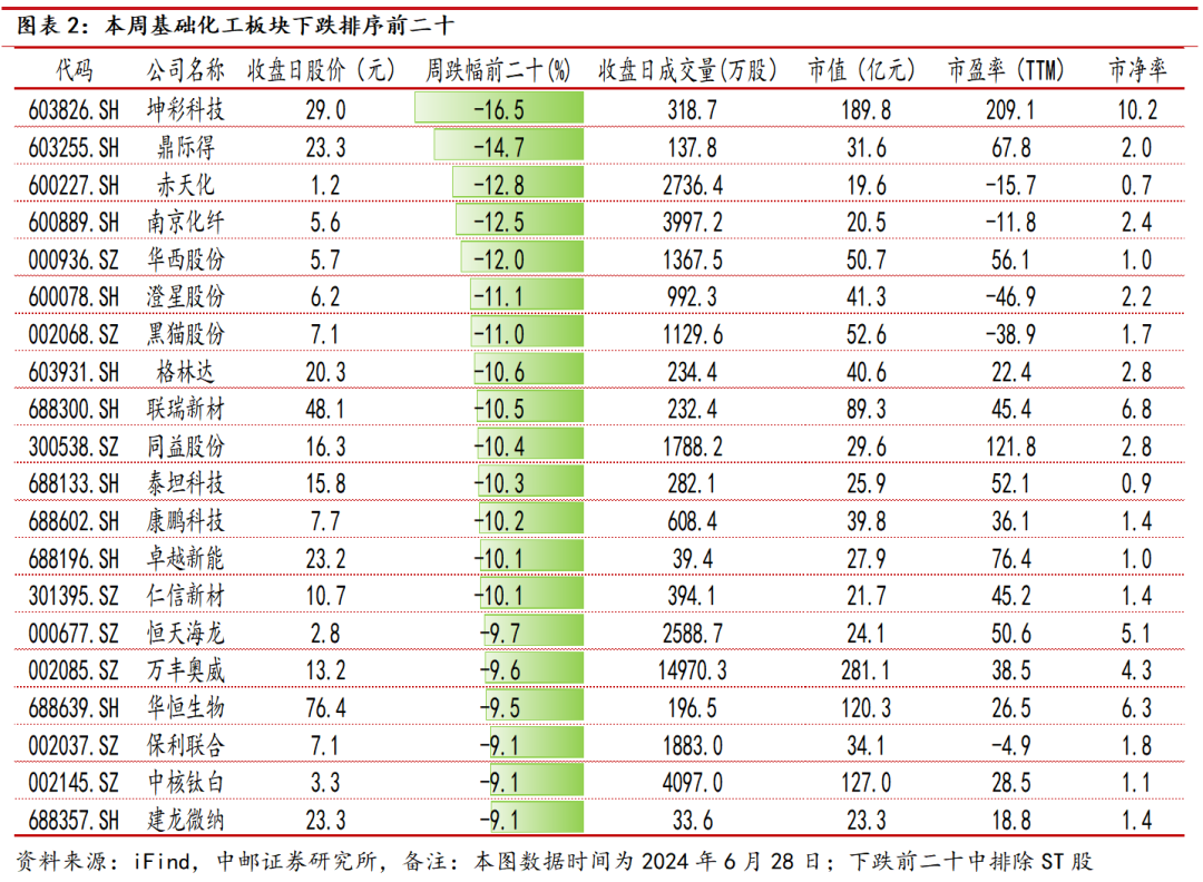 本周基础化工板块下跌排序前二十:坤彩科技(-16.50%)、鼎际得(-14.65%)、赤天化(-12.78%)、南京化纤(-12.50%)、华西股份(-12.00%)、澄星股份(-11.11%)、黑猫股份(-11.03%)、格林达(-10.64%)、联瑞新材(-10.48%)、同益股份(-10.41%)、泰坦科技(-10.34%)、康鹏科技(-10.23%)、卓越新能(-10.11%)、仁信新材(-10.10%)、恒天海龙(-9.71%)、万丰奥威(-9.62%)、华恒生物(-9.50%)、保利联合(-9.15%)、中核钛白(-9.14%)、建龙微纳(-9.13%)。