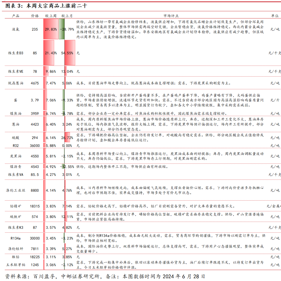本周大宗商品上涨前二十:液氯(29.83%)、维生素D3(21.43%)、维生素VE(9.86%)、脱晶蒽油(7.47%)、蛋(7.06%)、煤焦油(6.74%)、蒽油(6.40%)、硫酸(6.14%)、R32(5.88%)、炭黑油(5.81%)、煤沥青(4.92%)、维生素VA(4.27%)、涤纶工业丝(4.14%)、铅精矿(3.83%)、硫铁矿(3.80%)、维生素K3(3.57%)、R134a(3.45%)、涤纶短纤(3.39%)、粗铅(3.11%)、玉米胚芽粕(3.06%)。