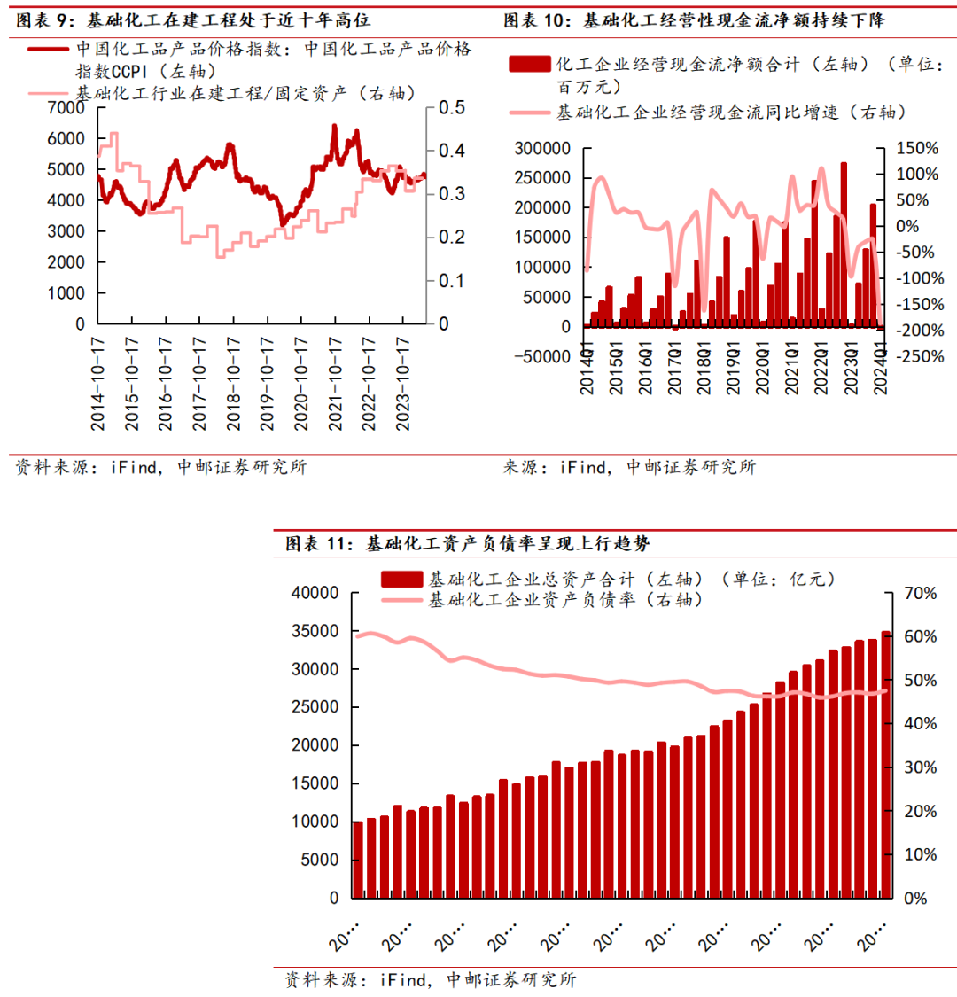 供给端,压力仍存,拐点可期。历经2020年-2021年景气周期,基础化工行业资本开支明显增长,截止2024年Q1末,基础化工在建工程/固定资产为33.55%,处于近十年高位。2022年-2024年Q1,受盈利能力下降影响,2022年Q1基础化工经营性现金流净额出现负增长,截止2024年Q1末,连五个季度为负增长。在此情况下,基础化工企业并未停止扩张步伐,选择持续加杠杆扩张产能。基础化工行业资产负债率自2022Q4拐点向上,2024年Q1末达到47.43%。