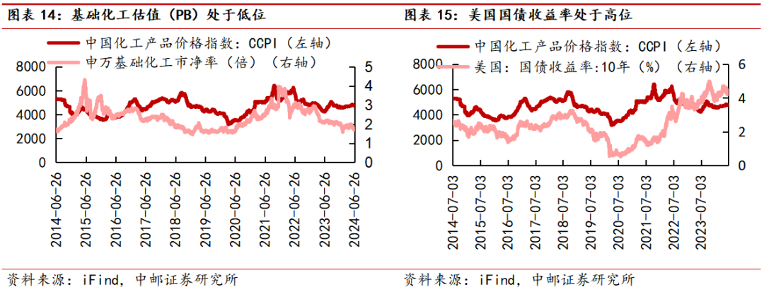 估值端,估值有望迎来提升。截止2024年6月28日,基础化工估值(PB)为1.70倍,处于2014年以来8.72%低分位,十年期美国国债收益率4.36%,处于2014年以来86.10%高分位,估值有望迎来提升。