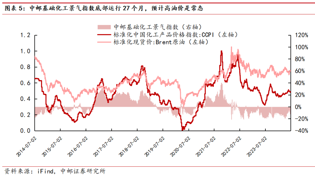 中邮证券基础化工景气指数底部运行约27个月。我们以Brent原油现货价格作为化工企业表示成本项,以中国化工品价格指数表示收入项,并将两种标准化处理,以两者差值表示化工企业盈利状况,命名为中邮证券基础化工指数。2020年3月—2021年10月基础化工盈利能力处于景气周期,持续时间约19个月,主因是内外需持续向好,叠加行业新增产能有限,行业进入主动补库存周期。2021年10月基础化工盈利出现向下拐点。2022年2月,受俄乌冲突等地缘政治因素影响,作为基础化工行业成本端的原油、煤炭等能源品供需偏紧。与此同时,基础化工行业受出口与内需增速放缓,行业开工率提升、资本开支转固等因素影响,供需偏于宽松,利润向产业链上游集中。此后,成本端供需偏紧,商品端供需宽松局面并未出现较大转变,基础化工行业盈利持续运行底部区间,运行时间约27个月。