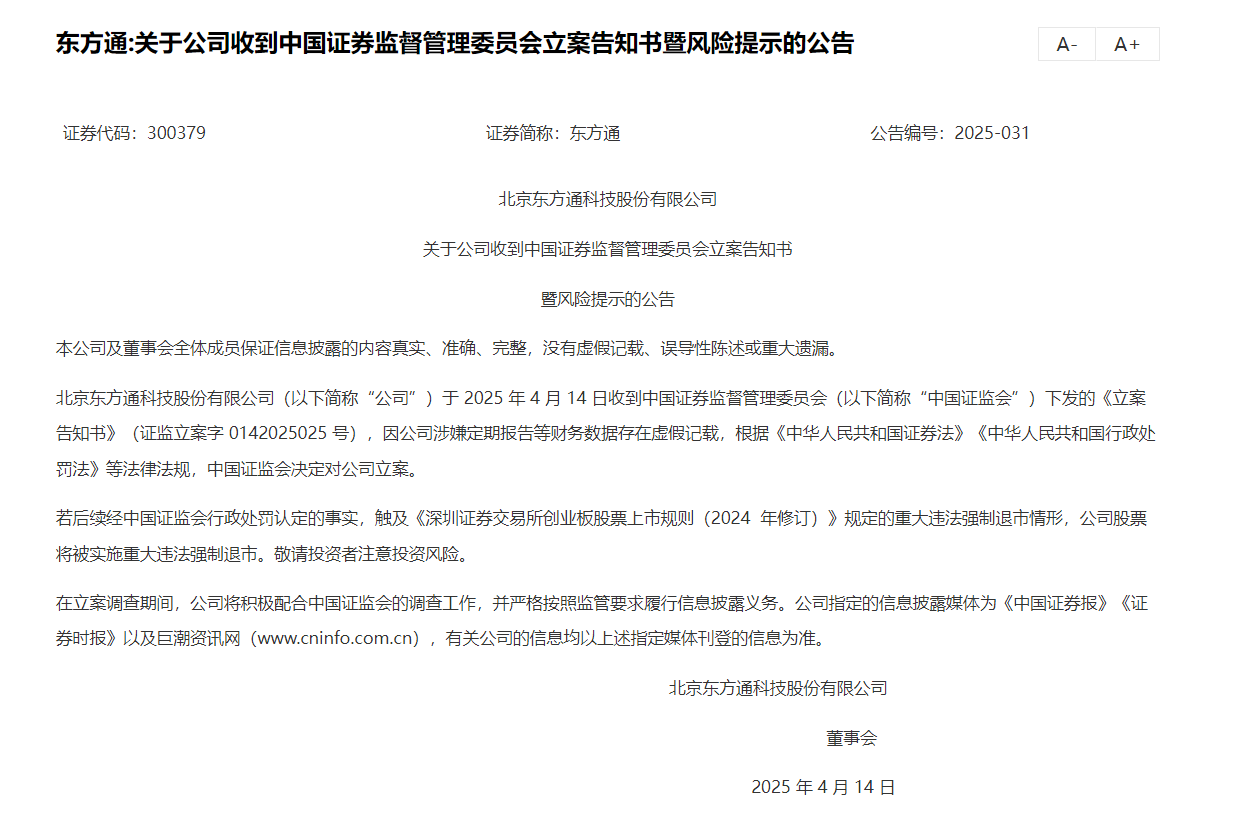 近日,东方通(维权)信因涉嫌财务造假被正式立案调查,这一消息犹如一颗重磅炸弹,在资本市场激起千层浪。其股价应声而落,短短时间便暴跌,投资者们损失惨重,市场信心遭受重创。