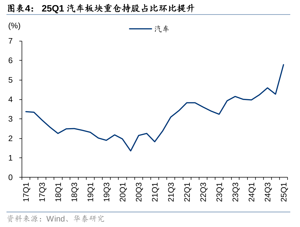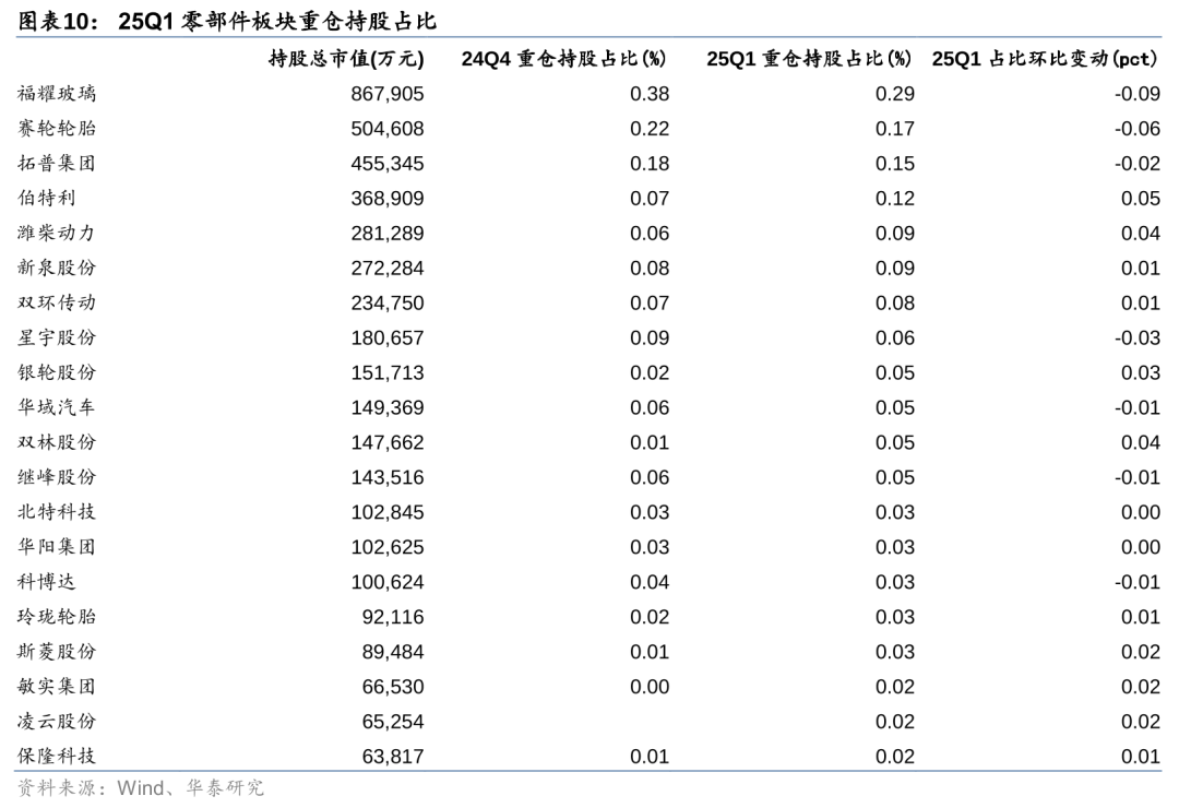 25Q1重仓持股占比环比提升的包括伯特利、潍柴动力、银轮股份、双林股份等,其中潍柴动力24Q4和25Q1持仓占比0.06%/0.09%,环比+0.04pct;福耀玻璃、赛轮轮胎、拓普集团等25Q1重仓持仓市值占比有所减少。