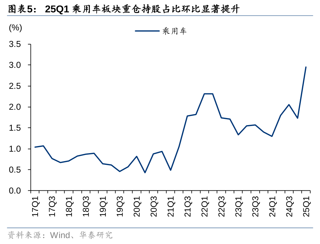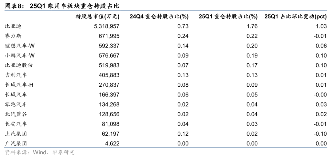 24Q4和25Q1汽车行业重仓持股市值累计为1263.6/1751.0亿元,环比减少188.9/增加487.4亿元;受比亚迪智驾平权带动智能化产业链发展、人形机器人等概念走强等影响,25Q1重仓持股市值环比大幅提升。市值占比方面,24Q4和25Q1占比4.27/5.78%,环比-0.33/+1.51pct。分子行业来看,以全部基金为统计口径,乘用车板块Q1持仓占比同环比大幅提升,市值占比创近8年新高:24Q4和25Q1占比1.73%/2.95%,环比-0.33/+1.22pct,同比+0.33/1.65pct;零部件板块24Q4和25Q1持仓占比1.72%/1.83%,环比-0.10/+0.11pct,同比-0.50/-0.31pct;商用车板块24Q4和25Q1持仓占比0.41%/0.36%,环比+0.02/-0.05pct,同比+0.25/+0.08pct。